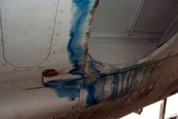 The Weep No More process and specially designed equipment were developed to apply this chemical inside the fuel tanks. This unique process results in the chemical removal of Polysulfide sealers previously removed primarily by hand scraping. The gruesome and laboriouse task of removing sealer by hand has been changed to a chemical process.